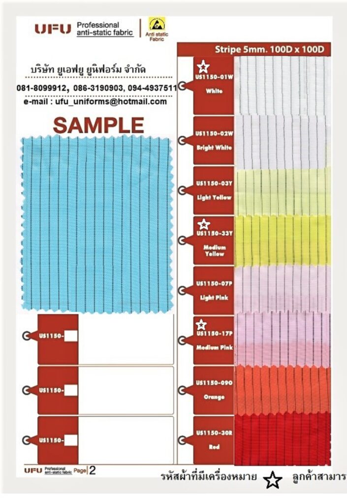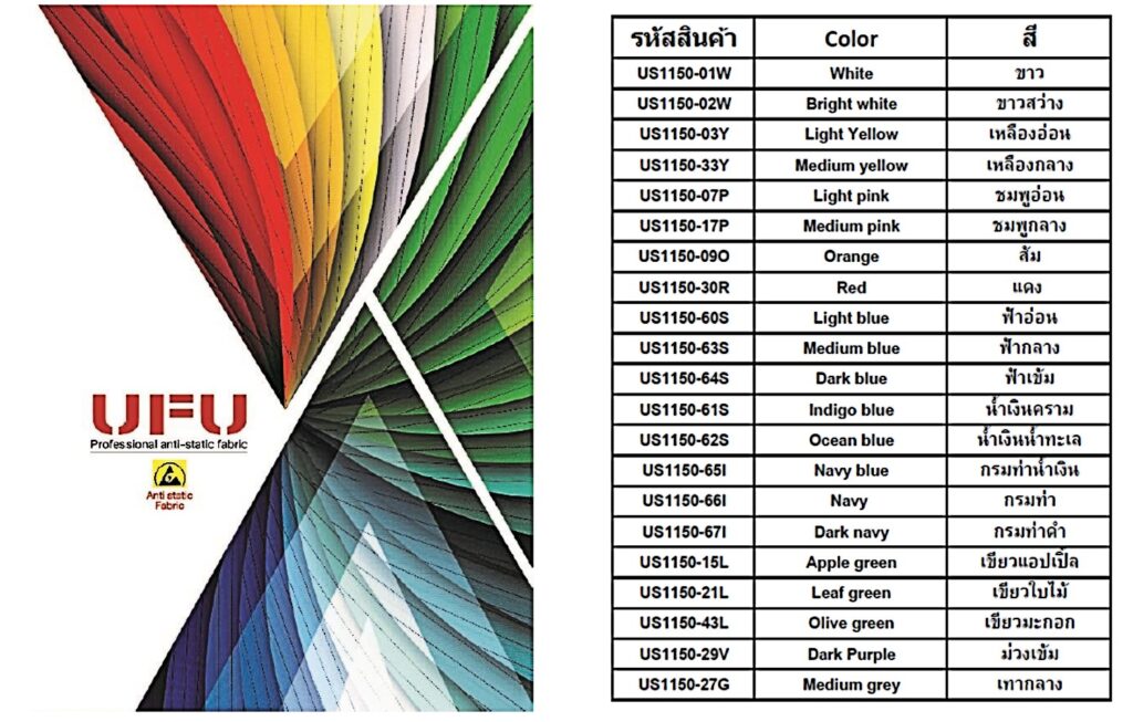 ยูเอฟยู จำหน่ายผ้ากันไฟฟ้าสถิตย์ Anti-static ESD เกรด A ซึ่งทอด้วยเส้นใยโพลีเอสเตอร์ และเส้นใย Conductive (เส้นสีดำ ในเนื้อผ้า) โดยมีแคตาล๊อกสีให้เลือกมากที่สุดในตลาดถึง 21 สี